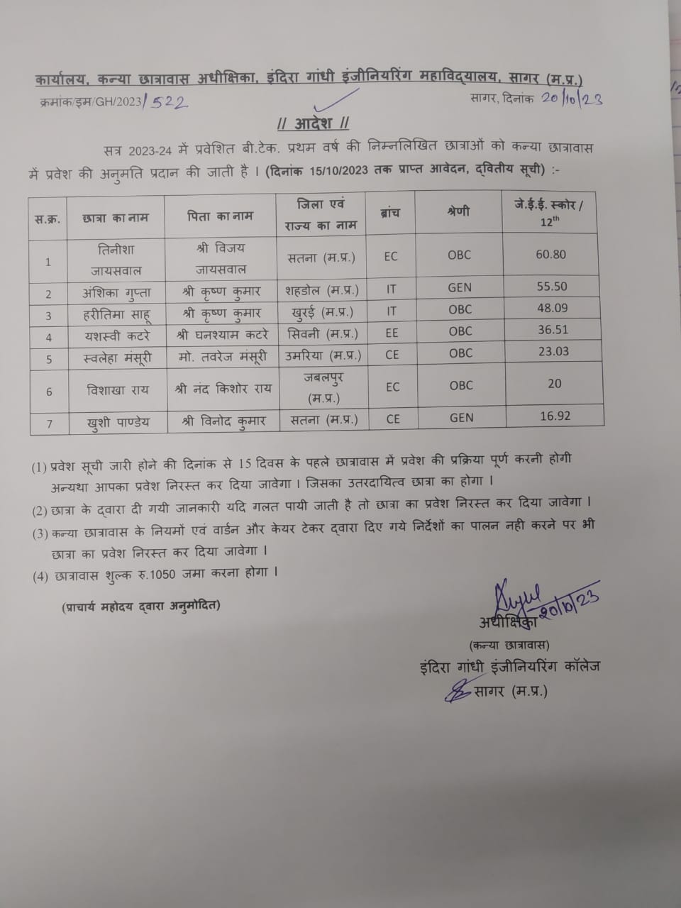 - Girls Hostel First Year Admission list 2023-24