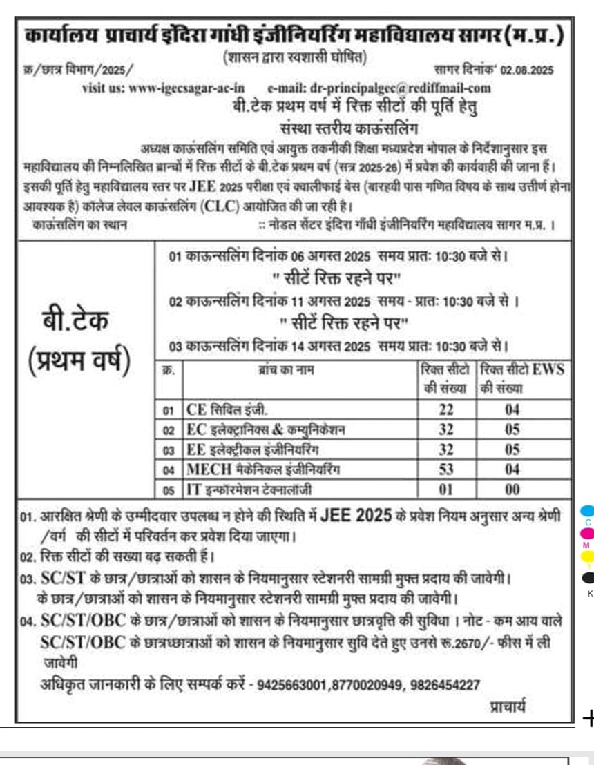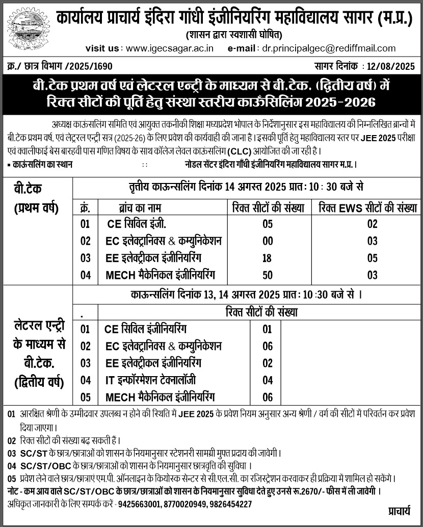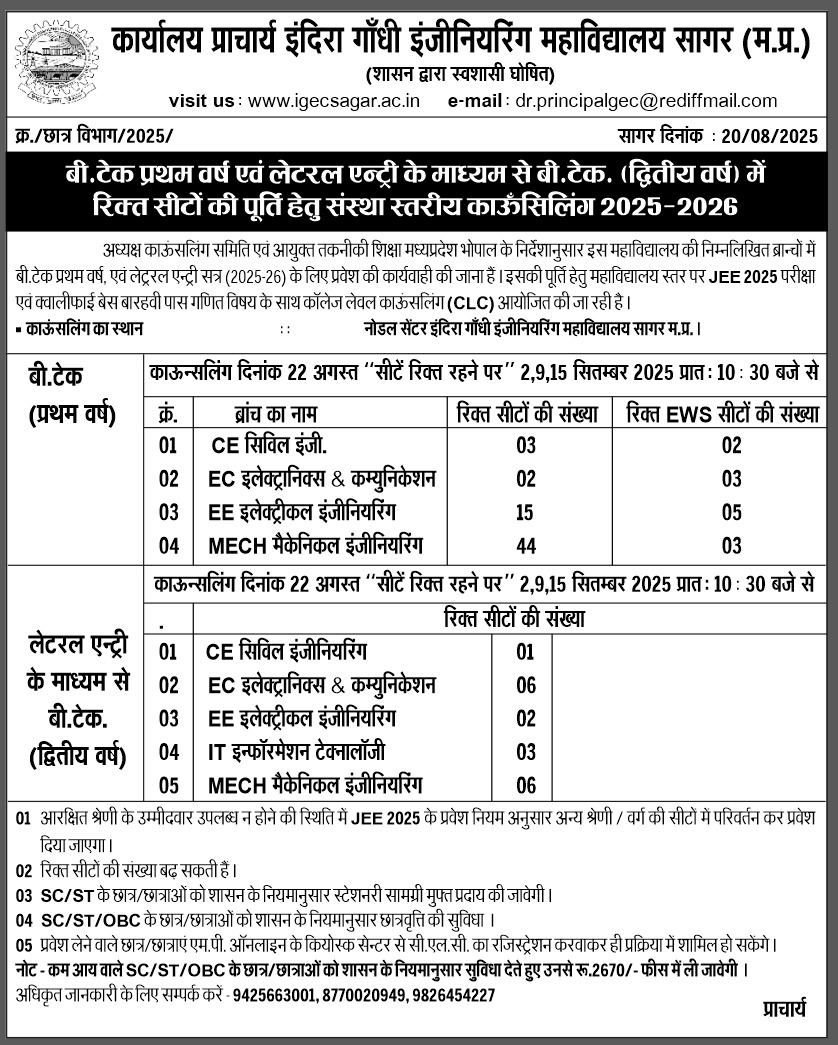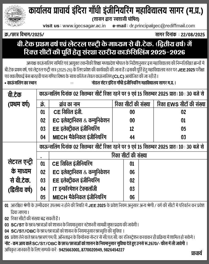 - College level counsling for B.tech first year and lateral entry second year students for vacant seat.