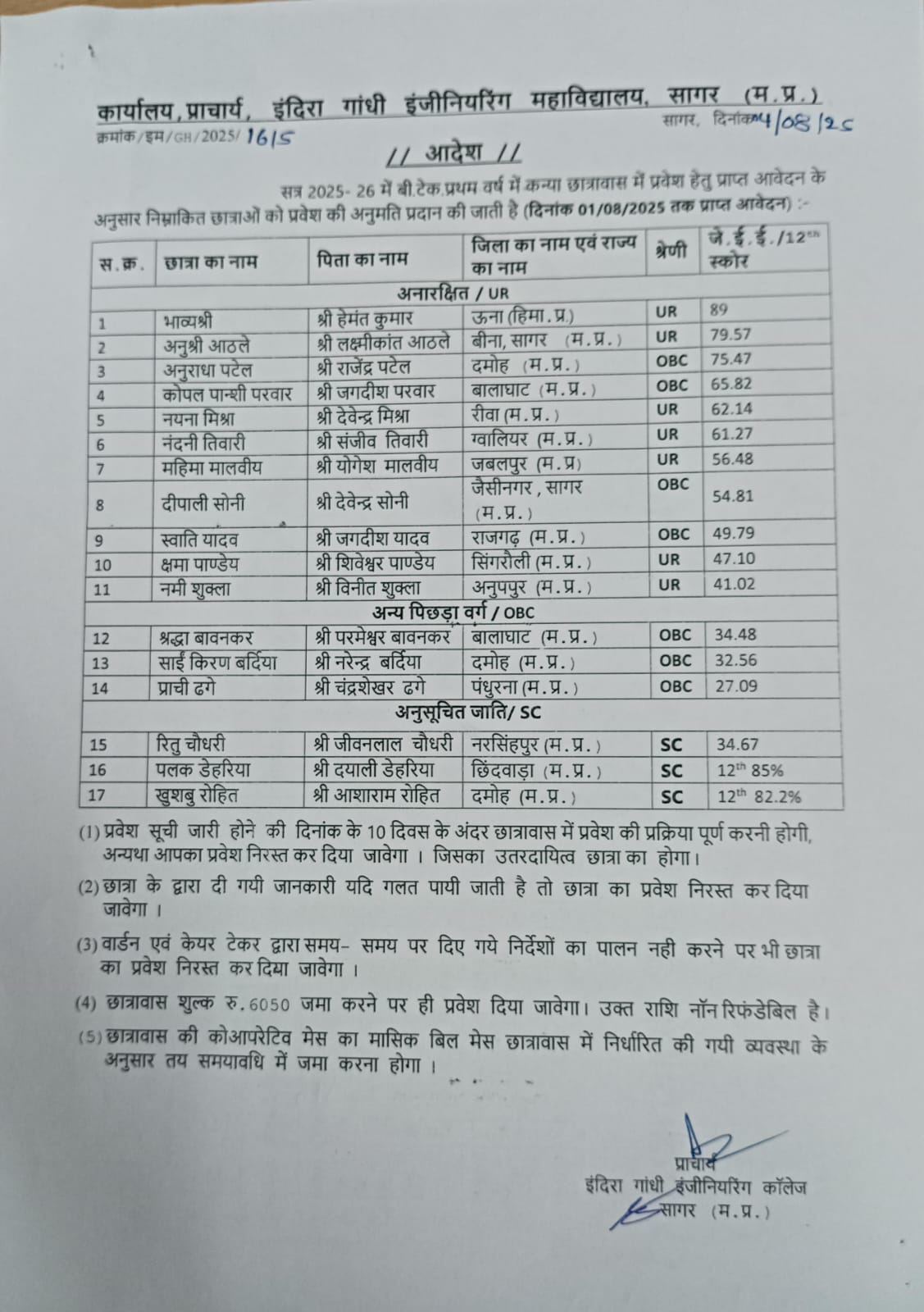 - Girls hostel allotment 2025-26