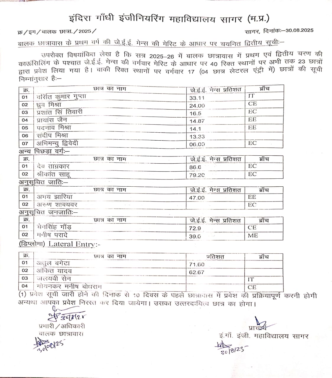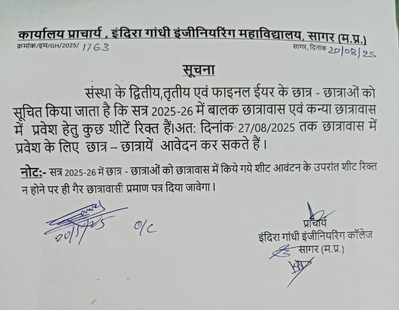 - Notice for Boys Hostel Allotment 2025-26 (Joining dates 18,19,20 August 2025)